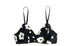 Underwire free, soft, stretchy bralette with elastic trimming and black adjustable straps. Off white motifs.